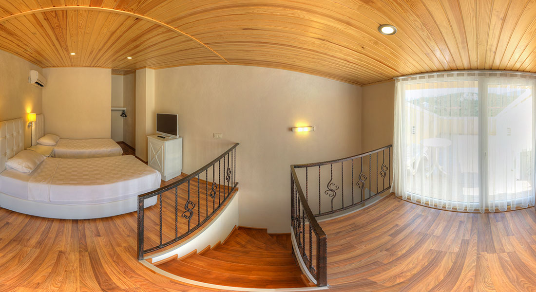 Alt katta bir adet çift kişilik yatak, üst katta 2 adet tek kişilik yatak mevcuttur. 2 katında kendine ait banyosu ve balkonu bulunmaktadır. Üst kata odanın içinden merdivenle çıkılmaktadır. İki odayı ayıran bir kapı bulunmamaktadır. Bu odalarımızda en fazla 5 kişi kalabilmektedir.